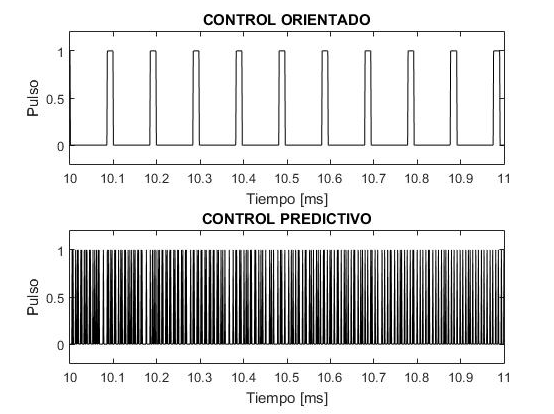 Un criterio de comparación es la característica de conmutación de los dispositivos del puente inversor. En el control orientado la conmutación depende de la técnica PWM utilizada, mientras que en el control predictivo la conmutación depende del tiempo de muestreo. La frecuencia de la portadora para la técnica SPWM en el controlador orientado de corriente es 20kHz y el tiempo de muestreo es 1µS. En Fig. 16, se muestran los pulsos de activación del mismo dispositivo para cada controlador. Los resultados muestran una alta exigencia en la operación de los semiconductores en el control predictivo de corriente.