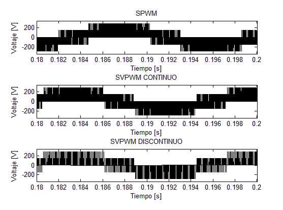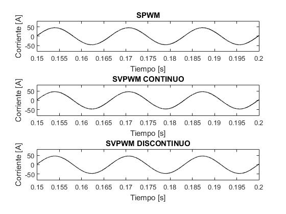 Los resultados mostrados corresponden a una de las fases. En Fig. 8 y Fig. 9 se muestran voltajes y corrientes obtenidas en la simulación de las técnicas PWM (SPWM, SVPWM continuo y discontinuo). Las señales de corriente tienen forma sinusoidal y amplitudes diferentes. En la técnica SPWM se presenta un transitorio y la corriente alcanza un valor de régimen permanente mayor respecto a las otras técnicas. Las señales de corriente SVPWM continuo y discontinuo están en fase y tienen amplitudes iguales.