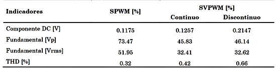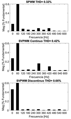 Una de las variables para evaluar el buen desempeño de la modulación SPWM es el contenido armónico. Como se mencionó antes, la técnica SVPWM presenta menor índice THD comparado con técnicas basadas en portadora [21], aunque los resultados obtenidos no validan la afirmación. Es claro, que este comportamiento está definido por una adecuada selección de vectores y secuencia de conmutación [24]. Por eso es importante la optimización de esta técnica de modulación, así como se expone en [28]