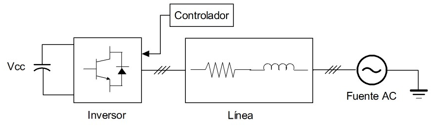 El inversor VSI está compuesto por un condensador, un conjunto de dispositivos semiconductores y un filtro. El condensador es el elemento almacenador de energía. Los semiconductores son los elementos que mediante su conmutación sintetizan las señales de referencia que son inyectadas a la red en el punto de conexión. El filtro atenúa el efecto armónico consecuencia de la conmutación del convertidor. Fig. 1 muestra el inversor VSI de tres ramas y sus componentes, en una conexión a red.