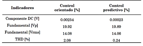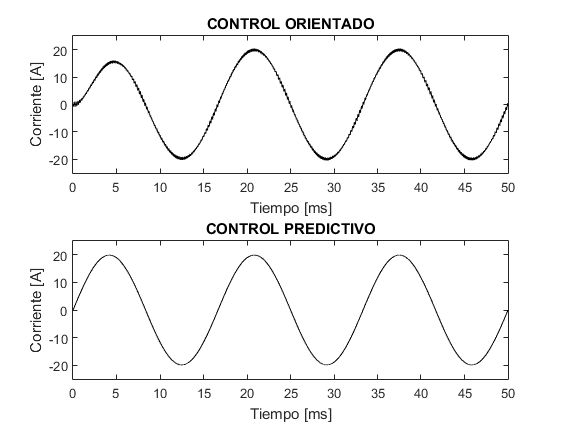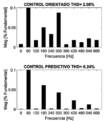En el control orientado de corriente se utilizó la técnica SPWM que presentó menor índice THD según el análisis anterior. La modulación en el caso del control predictivo es definida mediante la secuencia de conmutación que minimiza el error de la corriente. En Fig. 12 se observa que las dos técnicas alcanzan la corriente de referencia. La corriente del control orientado presenta mayor contenido armónico. El análisis de armónicos se muestra en Fig. 13. En la Tabla 3, se resumen los resultados.