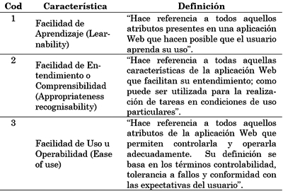 La ISO 25000-SQuaRE propone que la usabilidad de un producto software puede ser descompuesta en las siguientes características: facilidad de entendimiento (appropriateness recognisability), facilidad de aprendizaje (learnability), facilidad de uso (ease of use), facilidad de ayuda (helpfulness), accesibilidad técnica (technical accesibility), grado de atracción (attractiveness), y adherencia a normas o convenciones (compliance) [5] , como se ilustra en la Tabla 1.