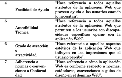 Estándares: en [5] . “hace referencia a cómo la aplicación Web es conforme respecto a normas, estándares, convenciones o guías de diseño en el dominio Web”.