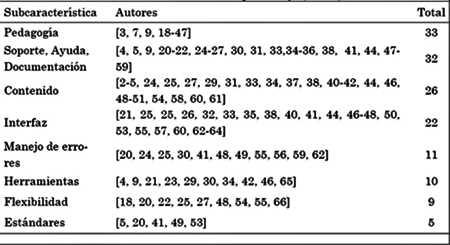 De las 70 fuentes se hizo un análisis para determinar los aspectos que cada autor propone para que un EVEA sea de calidad y usable. Se concluye según orden de prioridad (Ver Tabla 3) las siguientes subcaracterísticas: pedagogía, soporte - ayuda - documentación, contenido, interfaz de usuario, manejo de errores, herramientas y estándares; son las 8 subcaracterísticas cruciales que determinan el éxito del EVEA. En adelante para mayor claridad se llamarán características a los aspectos según norma ISO 9126 e ISO 25000 y subcaracterísticas a los aspectos que concluyó el análisis de la revisión sistemática de este artículo.
