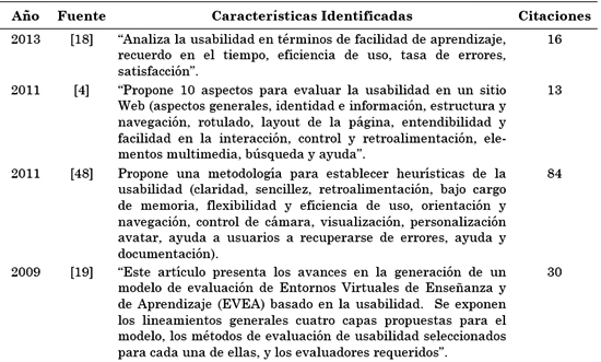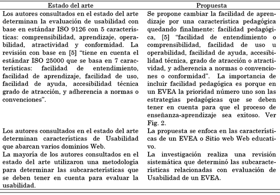 Para presentar con precisión los aportes de esta revisión a la literatura, se presenta a continuación una comparación (ver Tabla 4) relacionada con semejanzas y diferencias entre la documentación encontrada y la propuesta de los autores, con relación a la evaluación de la usabilidad de sitios Web educativos.