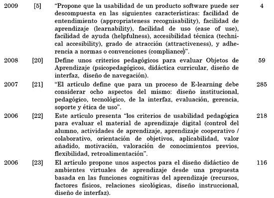 Al realizar el análisis de la documentación se identificaron subcaracterísticas que los autores seleccionados en la revisión sistemática recomiendan para evaluar un Entorno Virtual de Aprendizaje o Software Educativo vía Web. Cada artículo, tesis, conferencia, congreso tiene un número de citaciones con su respectivo autor, que avalan su prestigio y calidad. La Tabla 2 muestra los 15 documentos más representativos que ayudaron a determinar las características y subcaracterísticas que un EVEA debe tener para ser evaluado.