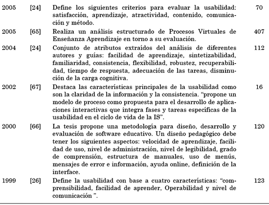 De los 108 documentos se seleccionaron, analizaron y validaron 70 fuentes [17] , relacionadas con características o aspectos que se deben tener en cuenta para evaluar que un Entorno Virtual de Aprendizaje o software Educativo vía Web sea usable.
