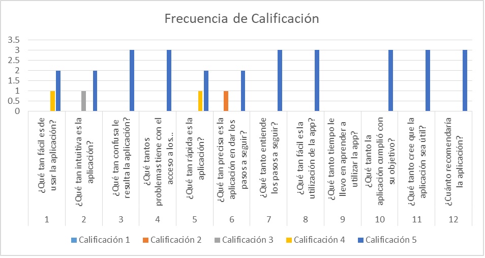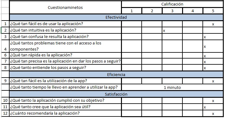 Para el uso de esta encuesta se utilizó una escala de 1 a 5, siendo 1 totalmente en desacuerdo y 5 totalmente de acuerdo. Esta encuesta fue aplicada a seis personas ciegas, dos de ellas con ceguera de nacimiento y las otras cuatro personas con pérdida de visión en su edad adulta; cabe mencionar que todas las pruebas fueron aplicadas a personas adultas, la prueba solo se realizó a seis personas, ya que fueron las que accedieron a ser evaluadas, además Nielsen [15] menciona que evaluar a más de cinco usuarios la información se vuelve repetitiva y para medir la usabilidad se requiere mínimo 5 usuarios. Como nota y para aclarar la pregunta “¿Cuánto tiempo le llevó aprender a utilizar la aplicación?”, se contesta con el tiempo y no basados en la escala.