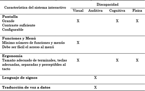 Para la construcción de la aplicación deben considerarse características específicas que debe cumplir un sistema interactivo, según la discapacidad a la que se esté centrando el desarrollo. Las características que se deben de considerar para una aplicación, dependiendo el tipo de discapacidad, son el tamaño de los botones, sonido, ergonomía, entre otras, como se puede observar en la Tabla 1. La aplicación se encuentra actualmente instalada en las computadoras del Sistema Nacional para el Desarrollo Integral de la Familia, conocido como DIF estatal de Aguascalientes, la cual es una institución que se enfoca en desarrollar el bienestar de las familias y personas con discapacidad.