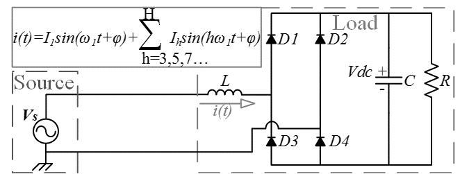 Several residential nonlinear loads are represented by a single phase equivalent circuit of a diode bridge rectifier, see Fig. 1. The CFLs have been closed represented by that model when the lamps are powered in it rated voltage. The model includes in its input an inductor L, which is in series with the rectifier bridge. The rectifier circuit powers a resistance R, which represents the power consumed by the load. The capacitance C is included to reduce the ripple in the resistance. The interaction of these three parameters defines the circuit dynamic and the shape of the current waveform drawing by the circuit.