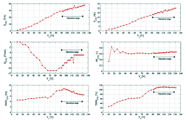 In Fig. 5 the behavior of apparent, real, and reactive power, power factor, THD of voltage, and THD of current when the terminal voltage is varied, can be observed. The behavior of those six variables characterizes the CFL when its terminal voltage is varied. Apparent and real powers have a similar behavior, both variables increase when the voltage increases. On the other hand, the reactive power absorbed (In this case, the reactive power negative values mean absorbed reactive power) increases in the voltage range between 10 V and 65 V. The reactive power exhibits a stable value of 5 vars in the voltage range between 116 V and 130 V. The tendencies of reactive and real powers result in a smoothly power factor variation in the voltage operation range. The THD of current varies from 20% to 110% in the whole voltage range, however the THD of current is practically constant in the operation range of the CFL between 90 V to 130 V. This behavior shows that a CFL has a low effect in a harmonics analysis as long as the terminal voltage is in the operation voltage range.