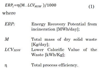Lower Calorific Value (LCV) of waste: The ERP from incineration depends on the LCV of the total waste. After the physical composition of the SW of each scenario is established, the total LCV can be estimated with the weighted LCV per kind of waste and its mass fraction.