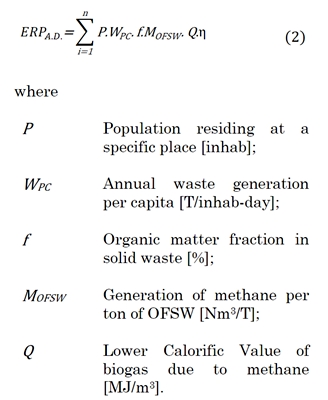 Anaerobic digestion: This is the preferred process for the organic fraction of MSW, which allows the activity of microbes in presence of humidity. The expression for calculating the electricity generation potential of the total organic fraction of the MSW is given in (2). The efficiency of the process was 26%, which corresponds to a reciprocating internal combustion engine in the literature [42].