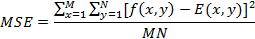 Donde f(x, y) es la imagen base y E(x, y) es la imagen con ruido, M y N son las columnas y las filas de las imágenes. Debido a que el Error Medio Cuadrático (MSE) depende del escalamiento de la intensidad de la imagen, esta relación es expresada en forma de una función logarítmica en unidades de decibeles para tratar de mantener una escala adecuada [36]. En (15) se presenta la conversión a decibles del MSE.