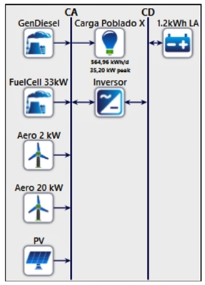 Por lo tanto, este documento presenta un análisis de la viabilidad técnica y económica, realizado a través del software HOMER, de una microrred conformada por fuentes renovables y no renovables, dimensionada para las características de poblados prototipos ubicados en dos latitudes de Colombia que pertenecen a las ZNI [16]. Igualmente, se evalúan y contrastan las distintas configuraciones viables de acuerdo con los recursos renovables solar y eólico presentes en cada zona, para luego incluir la CC en el mix energético y analizar así su impacto técnico en el dimensionamiento óptimo de los elementos, así como su viabilidad económica en la reducción de costos mediante los indicadores de valor presente neto y costo nivelado de la energía ($/kWh).