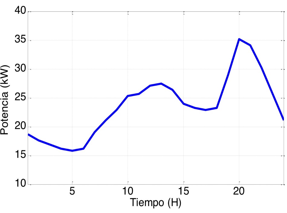 Para la obtención del perfil de carga del poblado, que se presenta en la Fig. 1, se aplica la curva de carga en porcentaje para un servicio de 24 horas, establecida por la CREG (Comisión de Regulación de Energía y Gas) para las ZNI [18], sobre la demanda total cuantificada en el paso anterior.