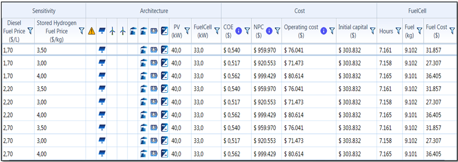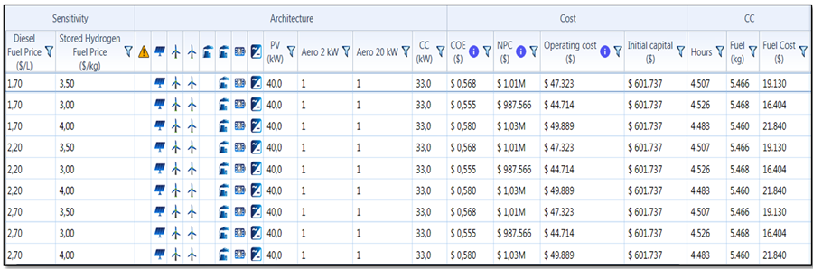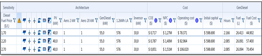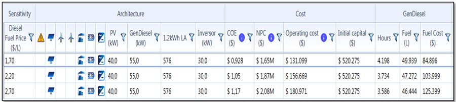 Finalmente, se lleva a cabo la ejecución de la simulación, la cual presenta como resultado, las distintas configuraciones viables de los componentes de la microrred frente a cada variable de sensibilidad. Esta información es presentada de acuerdo con los siguientes parámetros: VPN, $/kWh, costos de inversión inicial, horas de operación de los componentes, entre otros, además de presentar por cada configuración óptima de la microrred, toda la información detallada por componente, producción eléctrica, consumo de combustible, emisiones y otros parámetros importantes a lo largo de la evaluación del proyecto.