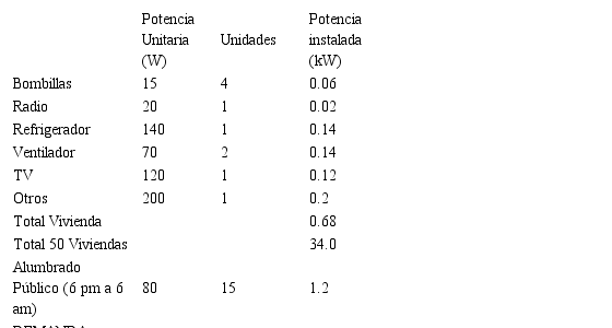 Para la cuantificación de la demanda, reportada en la Tabla 1, se realiza una estimación de las diferentes cargas que una vivienda puede poseer, las unidades y su consumo, de manera similar a como se describe en [17]. Se contempla el uso de un Plan URE (Uso Racional y Eficiente de la energía) con el uso de bombillas ahorradoras de 15 W para cada vivienda.