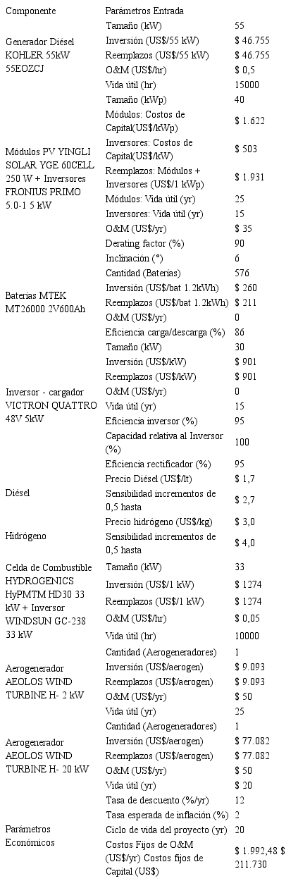 Luego de realizar los respectivos cálculos de costos, y adecuarlos acorde a cómo deben ser ingresados en HOMER, se muestra en la Tabla 2 los resultados correspondientes, de manera similar a [20], referenciando el equipo comercial tenido en cuenta para el análisis.