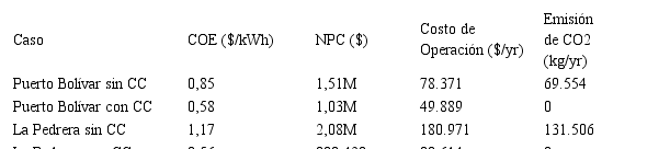 Finalmente, la Tabla 3 presenta un paralelo del estudio realizado para ambas poblaciones, donde se comparan los COE, NPC, costos de operación y emisión de CO2 de las soluciones con mayor costo de combustible de diésel e hidrógeno, con el fin de analizar los peores casos de viabilidad económica. Es de notar, que las instalaciones basadas en CC presentan mejores resultados económicos en comparación con las que dependen de generadores diésel, con el agregado de una reducción a cero emisiones de CO2 a la atmosfera. Dicha comparación evidencia la pertinencia del uso de las CC en microrredes para zonas no interconectadas como una solución técnico-económica viable para el suministro de una demanda energética en dos poblaciones con diferentes recursos ambientales.