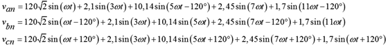 La componente fundamental de los voltajes de fase tiene un valor eficaz de 120 V y una frecuencia de 60 Hz, tiene armónicos a frecuencias 3ω, 5ω, 7ω y 11ω, donde ω = 2π60 rad/s. El tercer armónico tiene una amplitud de 1,18 % respecto de la amplitud de la componente fundamental, el quinto armónico de 5,98 %, el séptimo de 1,44 % y el armónico once de 1 %. La fuente de alimentación se ha modelado considerando una impedancia de corto circuito, la cual consiste en una resistencia en serie con una inductancia, el valor de la resistencia es de 20 mΩ y el de la inductancia de 0,2 mH.
