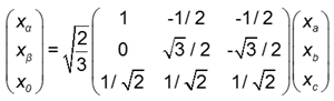 Para separar las componentes de potencia pcc y pca, se utiliza la matriz que se indica en (2), también conocida como la transformada de Clarke. Mediante esta matriz de transformación las tensiones y las corrientes trifásicas de la carga se refieren al marco de referencia α-β-0.
