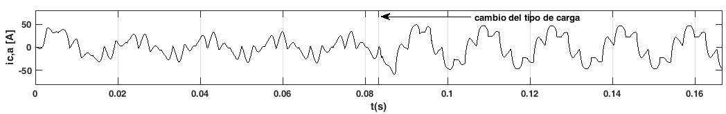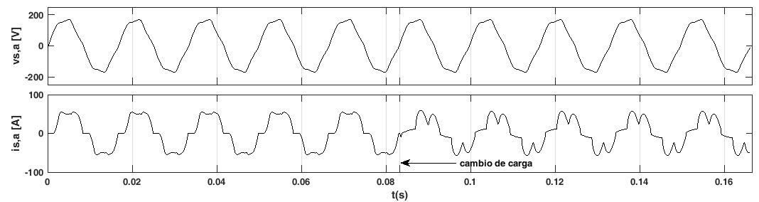 En la Fig. 8 se muestran 10 ciclos de la forma de onda de la tensión y la corriente de la fase a en la fuente de alimentación, sin la conexión del filtro activo de potencia. Al iniciar la simulación la carga no lineal 2 y la carga lineal están desconectadas, luego en cinco ciclos de la tensión de la red se desconecta la carga no lineal 1 y se conectan simultaneamente la carga no lineal 2 y la carga lineal.