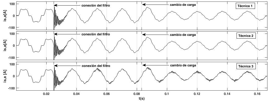 Para comparar el desempeño de las técnicas PWM empleadas, se utiliza la siguiente notación, la técnica 1 corresponde a PWM basada en SVM con banda fija de histeresis, la técnica 2 hace referencia a PWM por banda fija de histéresis y la técnica 3 representa la técnica PWM por banda adaptativa de histéresis. El filtro activo de potencia se conecta al sistema en 1/40 s, con el fin de conocer el desempeño de las técnicas PWM en el transitorio de arranque. En la Fig. 10 se muestran 10 ciclos de la corriente en la fase a, para las tres técnicas consideradas.