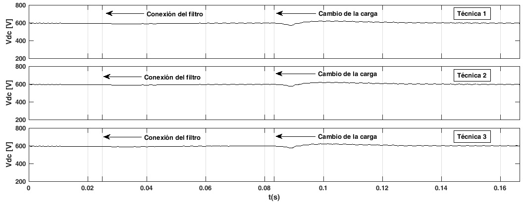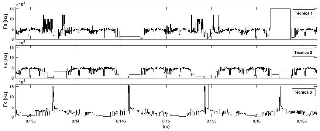 Los valores promedio de las frecuencias de conmutación se han calculado en un intervalo que comprende los últimos dos ciclos de las tensiones de red y son 37,9 kHz para la técnica 1, 35,47 kHz para la técnica 2 y 22,75 kHz para la técnica 3. Aunque la técnica 3 no mantiene constante la frecuencia de conmutación, es la que presenta el menor valor promedio y por ende las menores pérdidas de energía por conmutación. Su forma se aleja de ser una señal constante que es lo que se pretende con esta técnica, debido al rizado presente en la tensión del bus de CC del inversor VB. Las otras dos técnicas muestran un amplio rango de variación de la frecuencia de conmutación, la técnica 1 muestra un rango de [0,47-120] kHz y la técnica 2 de [0,786- 60] kHz.