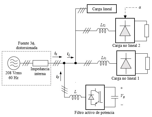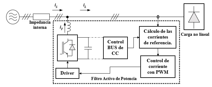 Los filtros activos de potencia o Active Power Filters (APF) son utilizados para la mitigación de armónicos producidos por cargas no lineales en los sistemas eléctricos de distribución. Dichos armónicos generan efectos nocivos, tanto en la red de distribución como en las cargas eléctricas de los usuarios que se conectan a ella [1]. Los APF se clasifican como serie, paralelo y mixtos, dependiendo del tipo de conexión con respecto a la carga. El APF en conexión paralelo o Shunt Active Power Filter (SAPF) es la conexión que se utliza en este trabajo. Su funcionamiento es similar al de una fuente de corriente controlada que inyecta componentes armónicas en contrafase a las que absorbe la carga no lineal, para anular su efecto en el punto de conexión de la carga con la red o Point of Common Coupling (PCC). De esta forma, otras cargas conectadas en el PCC no evidencian la presencia de armónicos y operan en condiciones normales de alimentación sinusoidal [2].