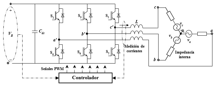 El SAPF utilizado en este trabajo se muestra en Fig. 2. El sistema consiste en un inversor de tres ramas y un condensador en el lado de CC, debido a su bajo costo en comparación con otras topologías, para sistemas de baja tensión [18]. El SAPF se conecta a la red por medio de la inductancia de acoplamiento L, que en ocasiones representa la inductancia de dispersión de un transformador con relación 1:1. En aras de la claridad, en Fig. 2 se omite las cargas (lineales y no lineales), que deben estar conectadas en los terminales abc de la red de alimentación.