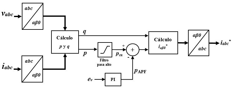 Finalmente, con la transformada inversa de Clarke se calculan las corrientes de referencia trifásicas iabc* en coordenadas abc. El algoritmo se describe gráficamente a través del diagrama de bloques que se muestra en la Fig. 3.