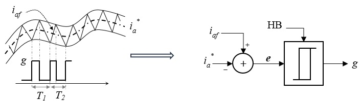 Para simplificar, se considera la fase a del sistema de potencia (sucede lo mismo para las demás fases). La corriente en la fase a, inyectada por el filtro al sistema de potencia se denota como ifa, la cual se compara con la respectiva corriente de referencia ia* obtenida por el algoritmo de compensación. La señal de error resultante, que se define como la diferencia entre ifa e ia*, se mantiene dentro de una banda de corriente de ancho fijo conocida como banda de histéresis (HB), que tiene la forma de la corriente de compensación, como se muestra en la Fig. 4.