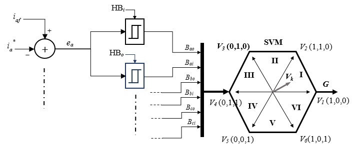 En [22] se propone una técnica PWM basada en SVM y banda fija de histéresis. La modulación por banda fija de histéresis permite obtener información previa de los vectores de espacio de conmutación adyacentes según el error de corriente. Dos conjuntos de estados cada uno constituido por tres elementos, son necesarios para implementar el comparador por banda de histéresis propuesto.