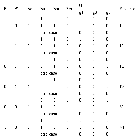 El espacio solución de la técnica SVM es un hexágono dividido en sextantes de acuerdo con la ubicación del vector de referencia. El valor de Bao, Bbo, Bco (primeras tres columnas de la Tabla 1) definen el sextante correspondiente. Mientras que los valores Bai, Bbi, Bci(siguientes tres columnas) están asociados a los vectores de espacio adyacentes del sextante seleccionado y las columnas g1, g3, g5 son los vectores de conmutación del inversor para el siguiente período de muestreo.