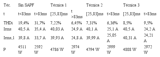 Según los resultados obtenidos, todas las técnicas PWM reducen significativamente el THD de las corrientes de la red de alimentación. Los resultados más significativos son de 19 % a 7,2 % antes de 83 ms con la técnica 1 y de 31,7 % a 6,36 % después de 83 ms para la técnica 2. La técnica 3 presenta el desempeño más bajo en la reducción del contenido armónico. También se aprecia un incremento en la potencia activa de la red de alimentación debido a la energía que requiere el filtro activo de potencia para regular la tensión en la barra de continua del inversor.