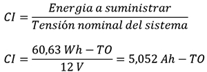 Para poder proporcionar autonomía a la micro-red aislada, en caso de presentarse baja irradiancia, se incluyó un banco de baterías capaz de suplir la demanda energética del usuario. Inicialmente, se debe definir el tiempo en el que el prototipo emulará un día de operación, el cual en este caso se estableció en 1,6 horas, es decir, que 4 minutos del emulador representan una hora de consumo (TO = 1,6 h). El criterio para la selección de este tiempo fue la facilidad de realizar pruebas equivalentes a un día en menos de 2 horas, esto con el fin de que el prototipo desarrollado, además de emplearse en actividades de investigación, también se pueda emplear en algunas prácticas en espacios académicos de maestría, por lo que tener tiempos de operación más prolongados limitaría el número de prácticas que se pueden realizar; además, un mayor tiempo de operación hace que se requieran sistemas de almacenamiento de mayor capacidad, lo cual va en contra del objetivo de que el emulador sea portátil y modular.