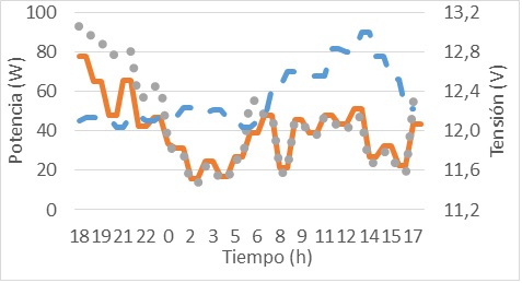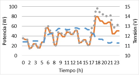 Prueba 3. En este caso se empleó una curva de irradiancia con una condición menos crítica que en los casos anteriores. La Fig. 14 presenta el comportamiento del nivel de tensión de 12 V (línea interrumpida) debido a la inyección de potencia realizada por el sistema FV. La potencia estimada corresponde a la línea punteada, mientras que la demanda medida es la línea continua. Para este caso no fue necesario que el sistema de gestión realizara un deslastre de cargas a lo largo del día.