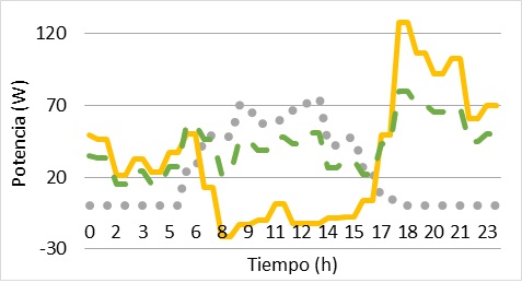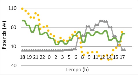 Los cambios después de las 17:00 h se deben a la demanda variable, debido a que el VE se encuentra en estado de recarga. La Fig. 15 presenta la potencia de los dispositivos propios del emulador. La línea punteada es la potencia de salida del SEPIC, la línea continua es la potencia en la batería FV, la línea interrumpida es la potencia demandada medida.