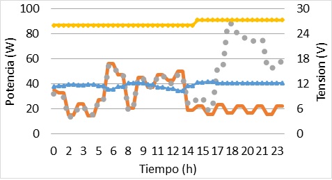 Prueba 2. En esta prueba se empleó una curva de irradiancia preestablecida. Los resultados de esta prueba se observan en la Fig. 12 y Fig. 13. En la Fig. 12 se observa la tensión en el barraje de 24 V (línea con rombos), la tensión en el barraje de 12 V (línea con triángulos), y la demanda estimada (línea punteada) y la demanda medida (línea continua).