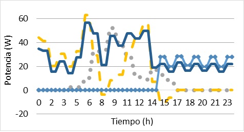 Fuente: autores.En donde la línea con marcadores es la potencia de salida del convertidor SEPIC, la línea punteada es la potencia en la batería FV y la línea continua es la potencia demandada por la micro-red.