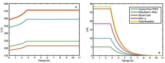 La micro-red propuesta facilita la integración de la tecnología V2G, mediante la cual se puede recargar la batería del VE y además contar con ella como fuente de suministro de energía para el sistema [20], [21]. La Fig. 5 muestra las curvas características de tensión y corriente correspondiente a la recarga de las baterías de algunos de los VE más representativos en el mercado [22]. El objetivo de la batería que se emplee en el emulador, es reproducir el comportamiento de las baterías reales usadas en VE, pero manteniendo los niveles de tensión y corriente dentro de los rangos establecidos para el emulador. En este sentido, empleando el software PSIM se simula el modelo de batería disponible en el paquete Matlab – Simulink, para una batería de 12 V y 7 Ah (Fig. 6).