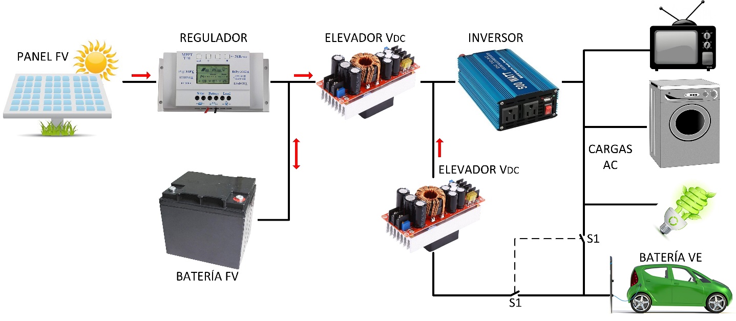 La topología que cumple con las condiciones descritas se presenta en la Fig. 1. Dentro de sus características principales se encuentran el uso de un panel fotovoltaico como fuente principal de generación; dos niveles de tensión DC impuestos por el conjunto regulador batería FV, VE, y tensión de operación del inversor; un nivel de tensión AC donde se conectan todas las cargas. Además, permite el uso del VE como fuente de respaldo al suministrar la energía de la batería del VE al barraje.