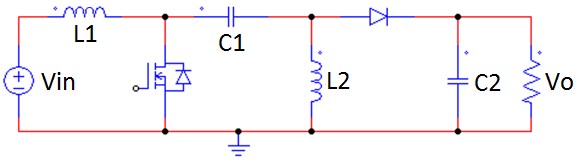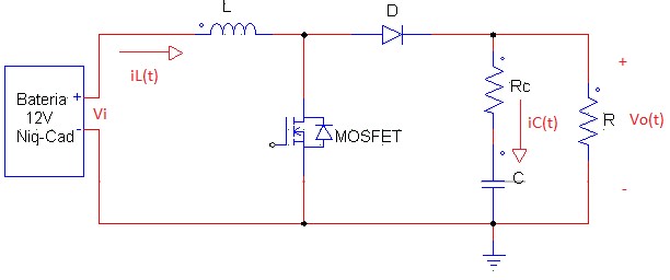 En donde VIN = 12 V es la tensión de entrada, VO = 24 V es la tensión de salida, PO = 150 W es la potencia de salida y FC = 20 kHz corresponde a la frecuencia de conmutación del convertidor. A partir de estos parámetros se tiene un ciclo útil (D) de 0,5, resistencia de carga R = 3,84 Ω , LMIN = 15 µH, C = 651 µF, porcentaje de rizado = 1%, IL = 8,68 A, IL_MAX = 16,6 A, IL_MIN = 0,6 A.