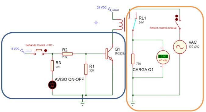 Fuente: autores.La etapa naranja de la Fig. 4 corresponde al circuito de potencia de la micro-red. Esta etapa cuenta con un interruptor que permite encender cargas de manera manual y un relé que, a partir de la señal del microcontrolador, permite la circulación de corriente hacia el resistor.