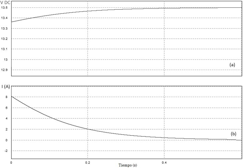 Comparando las características de la recarga de las baterías de los VE de la Fig. 5 y la batería a emular (Fig. 6), se observa que la batería de menor capacidad y menor tensión seleccionada reproduce adecuadamente el comportamiento de las baterías de los VE, con una tensión casi constante y la caída exponencial de la corriente durante la recarga, por supuesto en un tiempo mucho menor, lo cual es uno de los principios de funcionamiento del emulador.