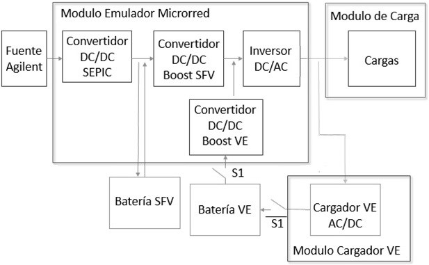 En la literatura es posible encontrar diferentes artículos enfocados a emuladores de micro-redes en diferentes contextos. En [24] se presenta una adecuada revisión y clasificación de los diferentes emuladores de micro-redes eléctricas, según los autores es posible clasificar un emulador de micro-red en uno de los cuatro niveles propuestos, el primer nivel dado a aquellos sistemas que permiten una emulación global; el segundo nivel en donde se contempla una emulación particular para la agregación de cargas, sistemas de almacenamiento y generación; un tercer nivel, en el que se contempla la emulación del recurso; y un cuarto nivel, enfocado a la emulación específica de los componentes, siendo en este nivel en el que se encuentra el emulador que se aborda en el presente artículo. El emulador propuesto emula el recurso fotovoltaico, la tecnología V2G, así como su interacción con la carga y el sistema de almacenamiento. También presenta desde el punto de vista del hardware los diferentes equipos convertidores (Boost, SEPIC e Inversor) con la posibilidad de ser reprogramados para cambiar sus controladores y sus puntos de operación dentro de ciertos rangos permitidos.