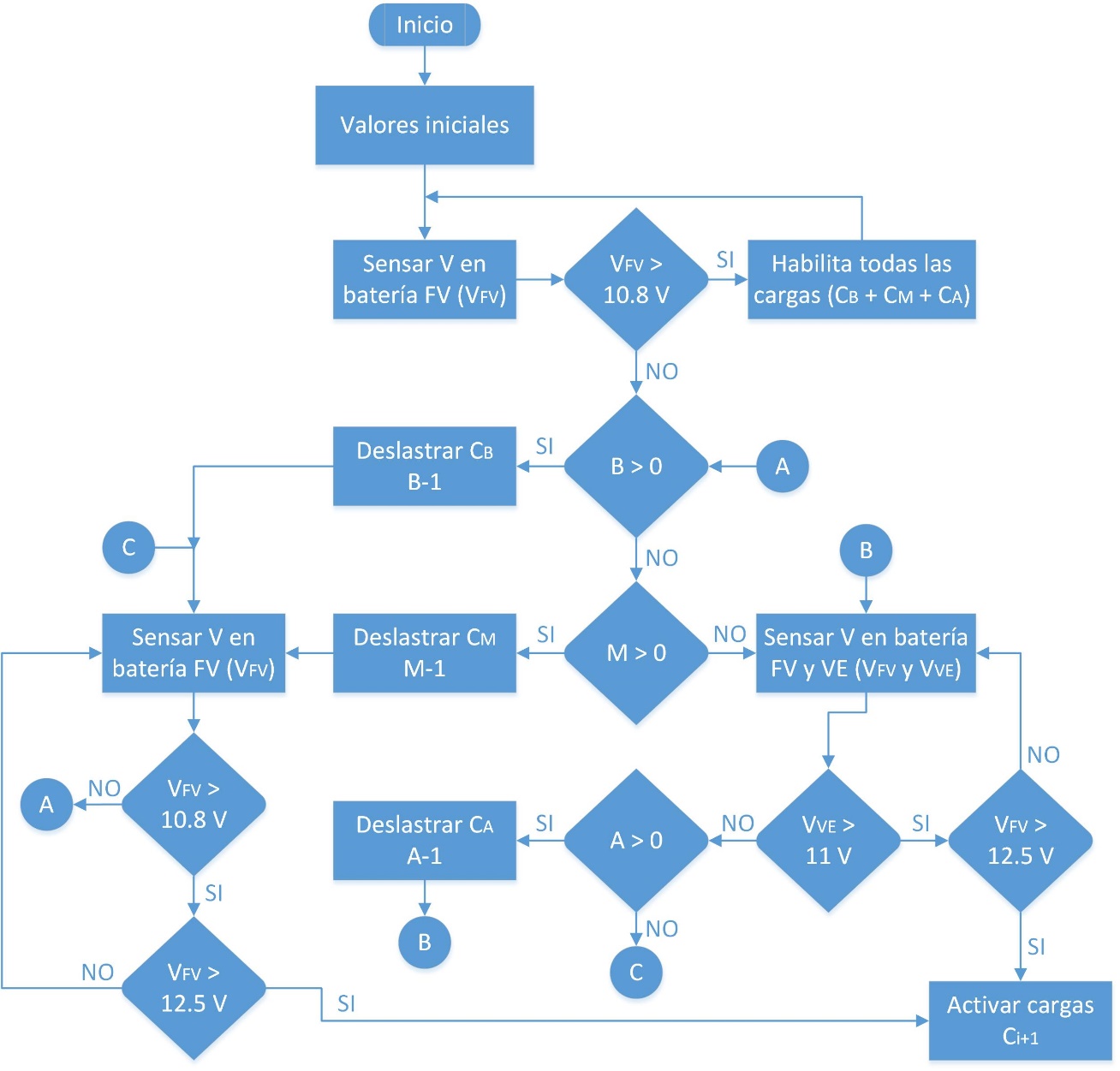Inicialmente, el sistema de gestión evalúa VFV, y si es mayor a 10,8 V habilita todas las cargas y desactiva el VE como fuente de respaldo. Cuando el nivel de tensión cae por debajo de 10,8 V se inicia un deslastre progresivo de las cargas de baja (CB) y media (CM) prioridad. Esta lógica se repite hasta que se cumpla con la condición establecida para VFV. Cuando las condiciones de la batería FV determinan que es necesario el deslastre de todas las cargas de baja y media prioridad (los contadores B y M = 0), el sistema de gestión puede habilitar el VE como fuente de generación, para esto el sistema sensa VVE, si es mayor a 11 V la habilita como fuente de respaldo para alimentar las cargas de alta prioridad (CA). Cuando la tensión cae por debajo de 11 V el sistema deslastra las cargas de alta prioridad.