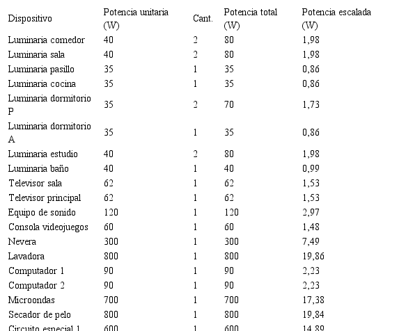 Esta encuesta fue realizada siguiendo el procedimiento propuesto en [17] a una muestra de 85 usuarios, con un intervalo de confianza del 90 % y un error del 5 %. Como resultado del proceso, se identificaron los principales electrodomésticos y las diferentes horas del día en que son usados. Posteriormente, se seleccionaron los 9 artefactos de mayor relevancia y se adicionó un circuito para alimentar el vehículo eléctrico, para conformar 20 circuitos en la vivienda con una potencia total de 6039 W (Tabla 1).