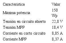 Con estos datos se buscó un panel fotovoltaico con corriente de corto circuito cercana a los 9,5 A y que además, bajo condiciones nominales de operación, sea capaz de suministrar la potencia máxima escalada demandada por un usuario, así como las posibles pérdidas que se presentan durante la transformación de energía. Por lo tanto, se seleccionó un panel con las características que se presentan en la Tabla 2